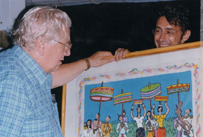 In a country swathed in destruction, turmoil, and genocide artist Stephane Delapree is doing something different. He is painting pictures of happy people, happy Cambodian people. Stef is a happy guy who paints happy paintings. He paints pictures of happy monks, happy mothers hanging out in hammocks, happy women drying laundry, happy people driving motorcycles, happy guys bicycling many bags of rice. The list goes on. But they're all happy. Happy, happy, happy. His work shows the joy of life, and you can't help but feel good when you look at his paintings.